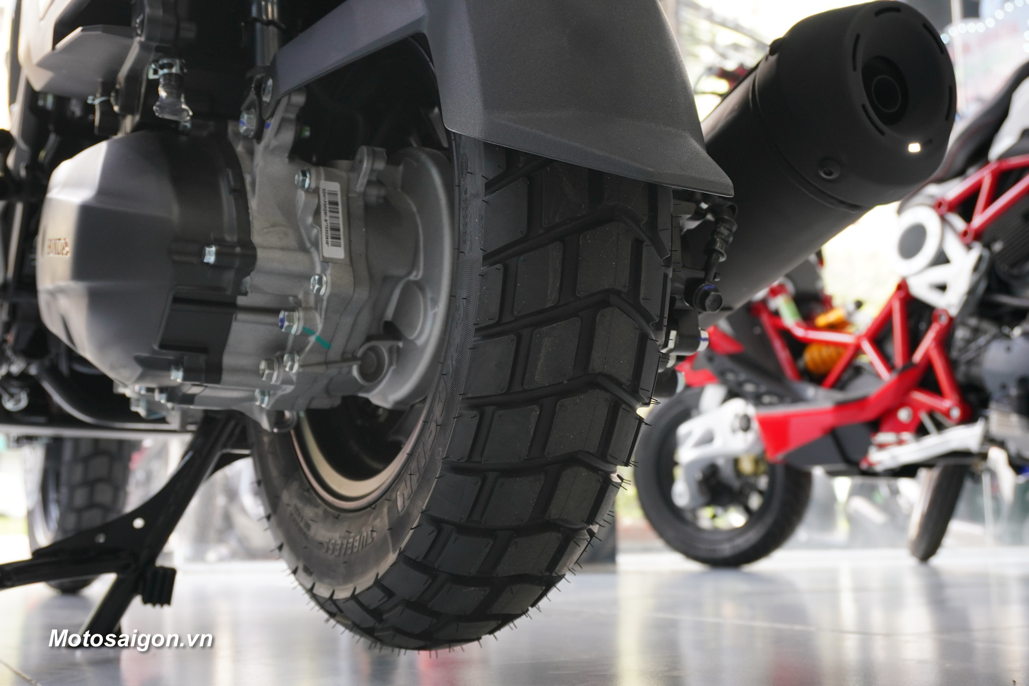 Khung sườn của xe được thiết kế lộ thiên một phần, kết hợp với các mảng ốp thân xe cắt gọt dứt khoát, tạo nên tổng thể cứng cáp và đậm chất kỹ thuật.